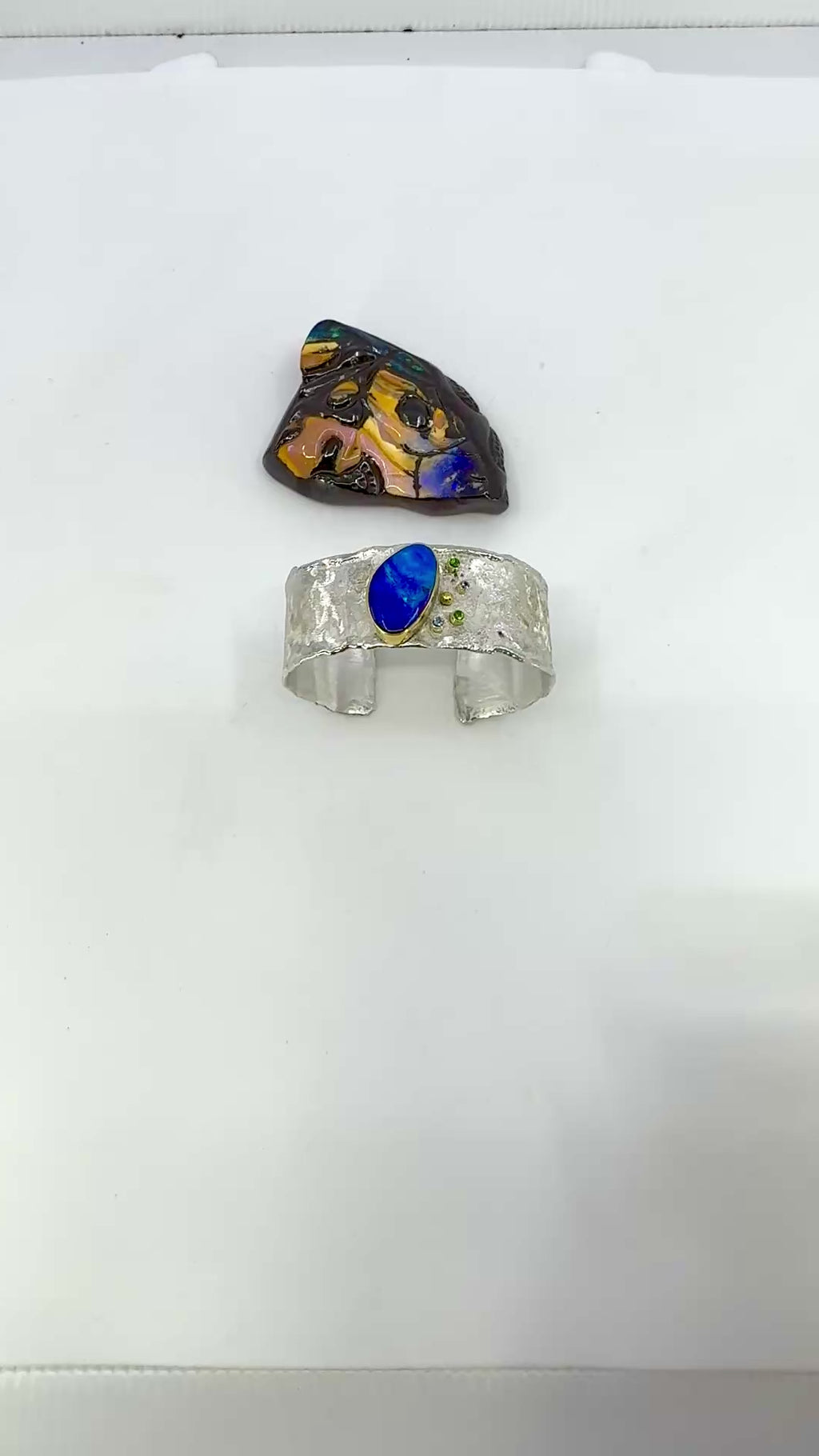 This exquisite cuff bracelet showcases a stunning boulder opal centerpiece, its mesmerizing blue, green and purple fire capturing light with ethereal beauty. Crafted from a refined blend of 22k gold, 18k gold, and sterling silver, the piece balances luxury with wearability. Delicate sapphire and chrome diopside accents enhance the opal's natural radiance, while gold dust scattered across the sterling silver cuff adds an enchanting shimmer. A sophisticated statement piece that transforms any ensemble with understated elegance and timeless allure.