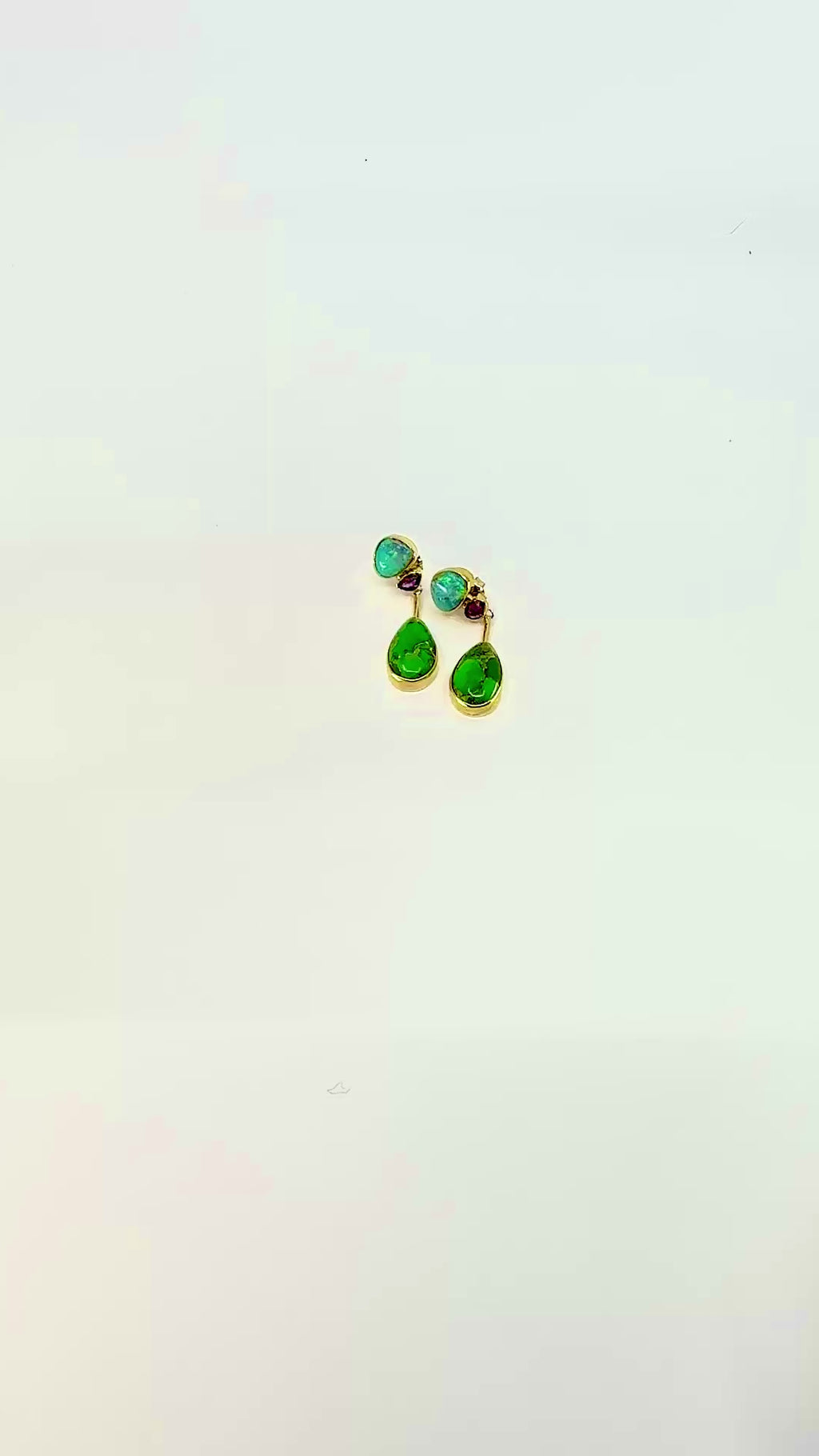 These audacious boulder opal earrings blur the line between raw earth and refined luxury. Swirling with natural opal patterns, sapphire, and turquoise infused with brass set in 22k and 18k gold—a fearless celebration of color and texture. Wear them when you're ready to make a statement: bold, unapologetic, and utterly alive. Perfect for those who refuse to play it safe.