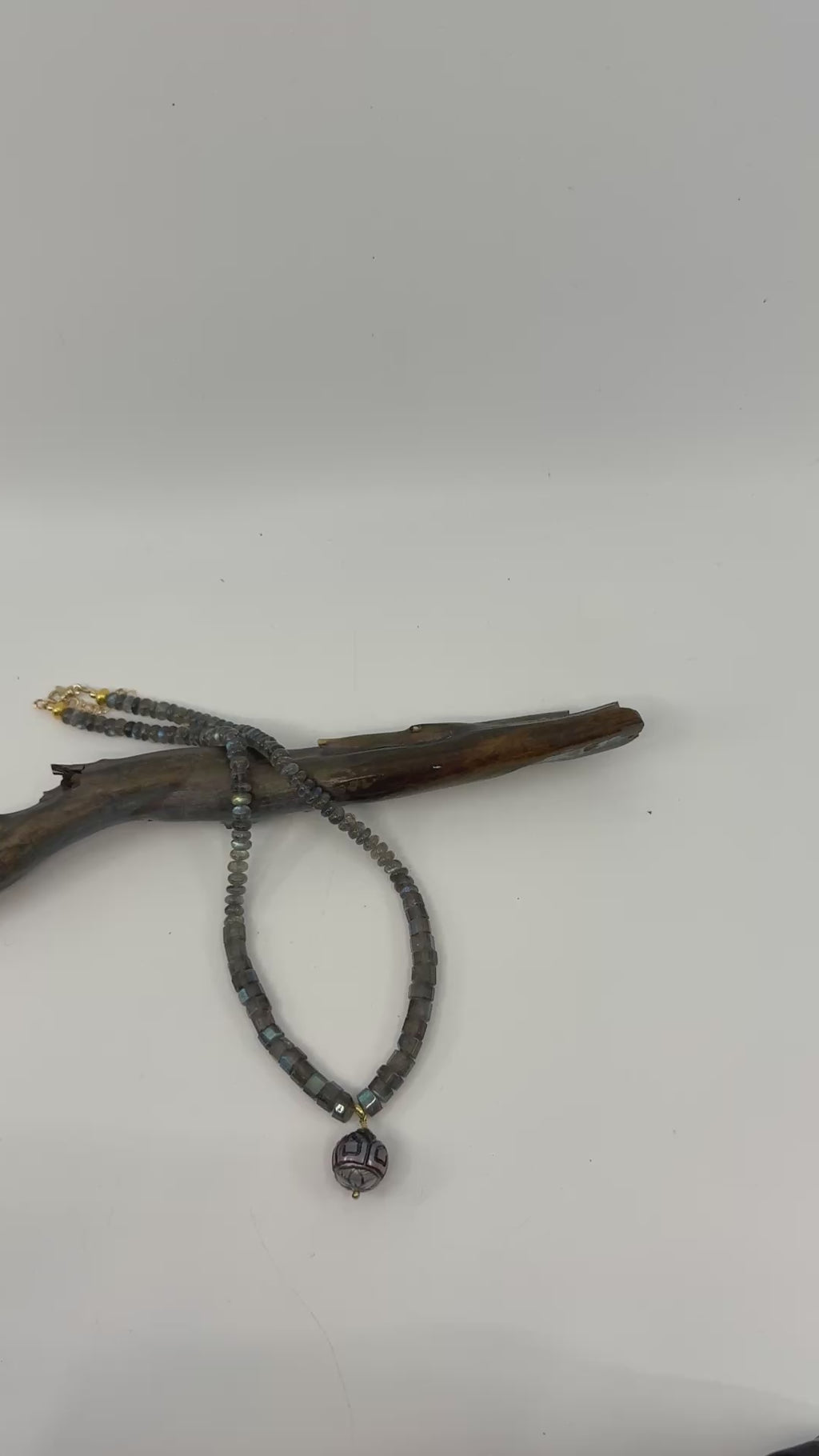 Luminous carved black pearl anchors this refined necklace, paired with geometric square and rondel labradorite beads that catch light with subtle iridescence. Accented with 18k gold beads and 14k gold findings, the piece strikes an elegant balance between statement and versatility. Wear it solo for understated sophistication or layer it with complementary pieces to build a curated look.