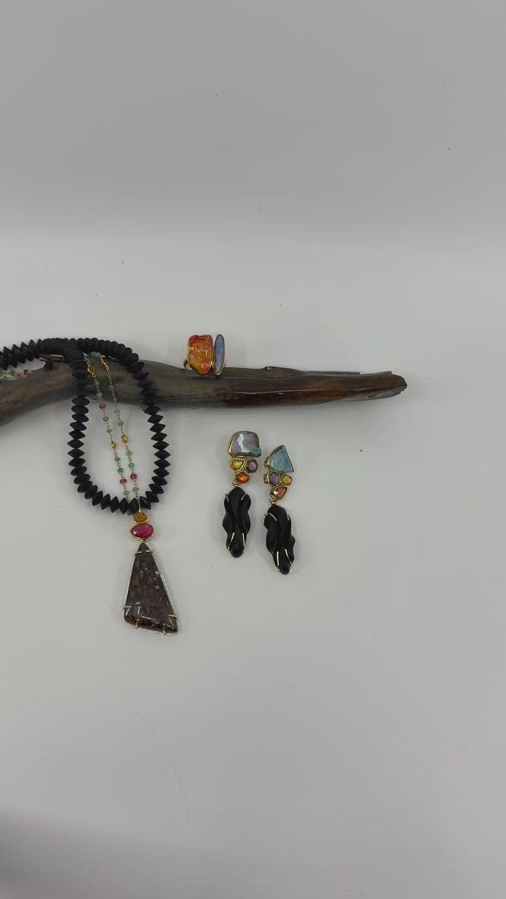 This striking ring unites two of nature's most captivating opals in a bold statement piece. Mexican opal's ethereal play of light meets Australian boulder opal's raw, fiery brilliance—where deep blues, vibrant oranges, emerald greens, and molten gold dance across the stone. The contrast between the delicate translucence of Mexican opal and the dramatic veining of boulder opal creates an unforgettable visual tension. Crafted in 22k, 18k, 14k gold, this is a ring for those who refuse to blend in.